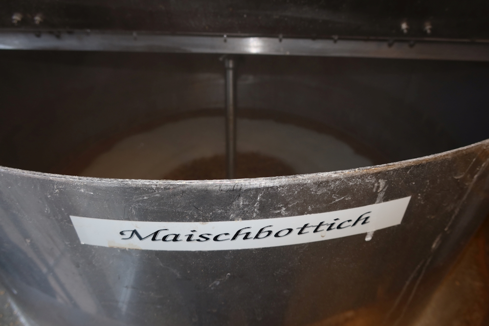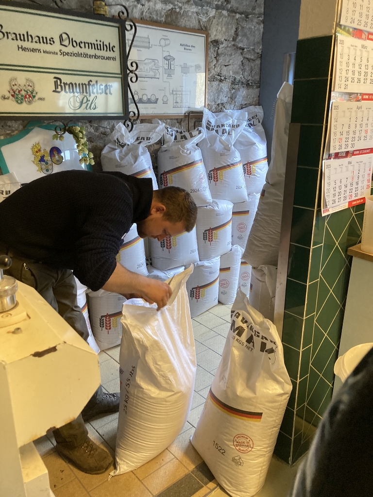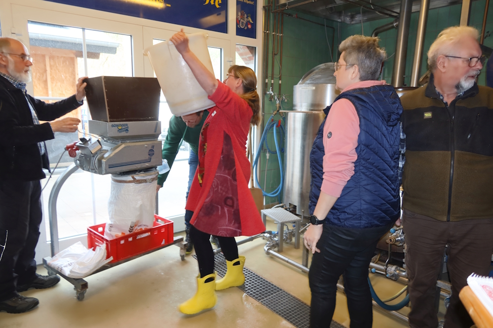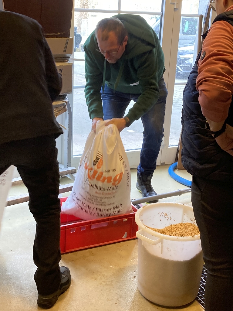 Im ersten Schritt wurde das Malz geschrotet. Für unser „Wiener Lager“ waren das die vier Sorten Pilsener Mal (20kg), Wiener Malz (80kg), Münchner Malz (4kg) und Cara Blond (14kg). Malzlogistiger Torben war der Mann für die schweren Säcke, Wiegemeister Andreas achtet darauf, dass die Einwaage aufs Gramm genau stimmte. Im nächsten Schritt befeuchteten die Konditioniererinnen Kirsten und Steffi das Malz in großen Eimern mit Wasser. Dadurch wurde erreicht, dass die Spelzen weich wurden und so verhindert, dass sie beim Schroten brechen, was für den späteren Läuterungsprozess wichtig war. Meinhard war der Maschinist an der Mühle und hat Eimer für Eimer Malz durchlaufen lassen.