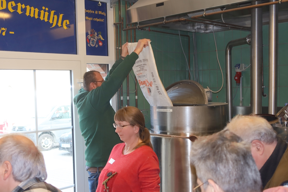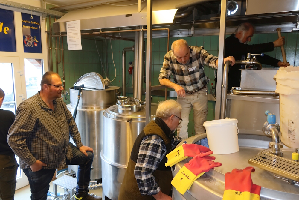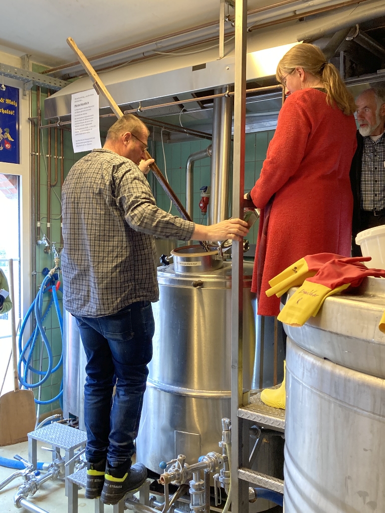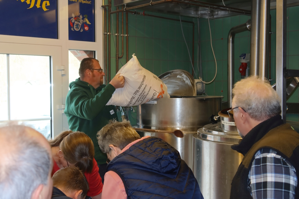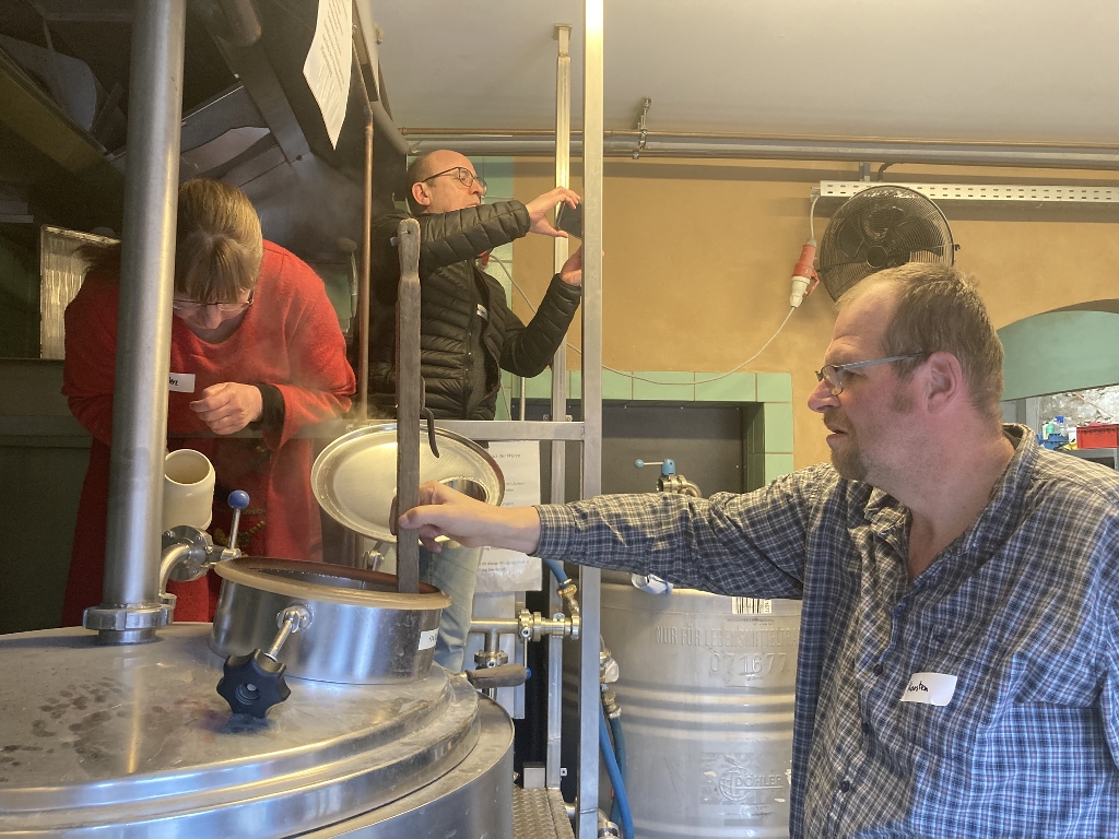 Nach einer Einführung durch Braumeister Achim Franzen, ging es auch gleich zur Sache. Schließlich musste der Sud 8 Stunden fertig zubereitet zur Vergärung in den Gärbottich kommen.