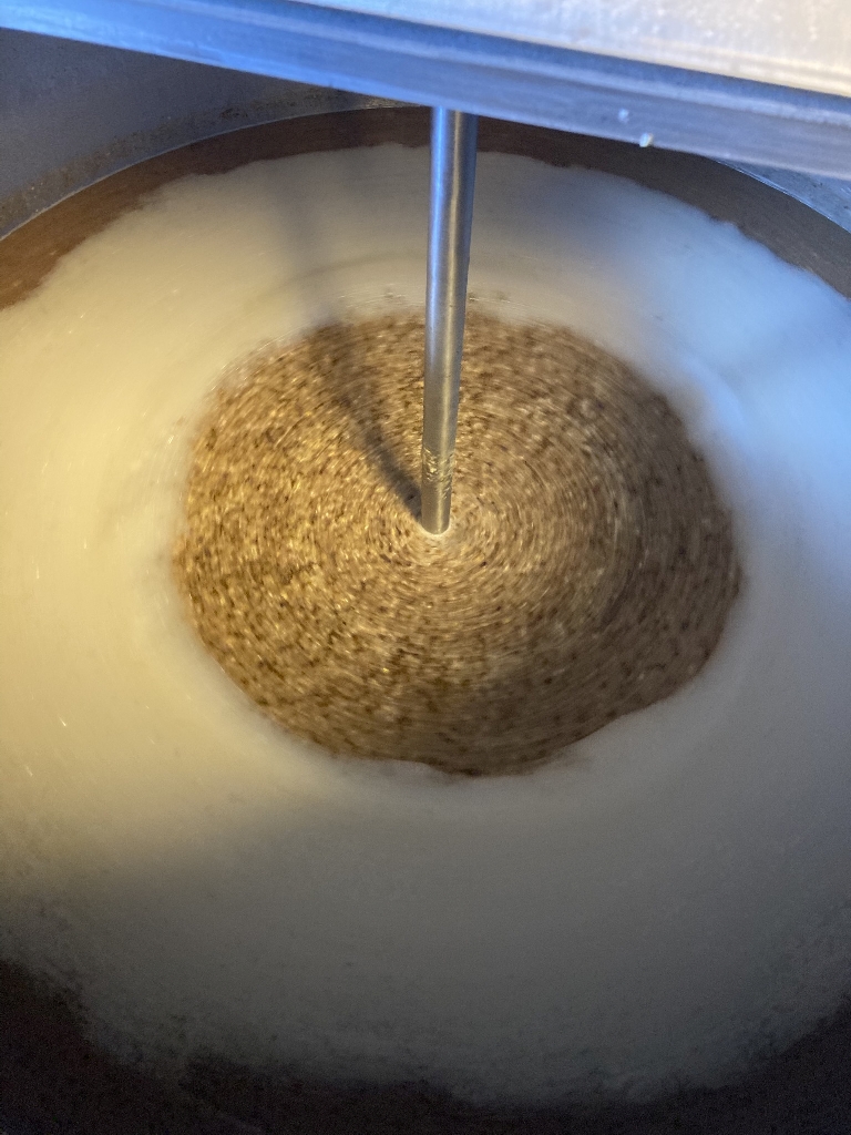 Nach Ende der Rast wurde die Maische auf 76°C hochgeheizt und abgemaischt, d.h. über eine Pumpe in den Läuterbottich gepumpt.