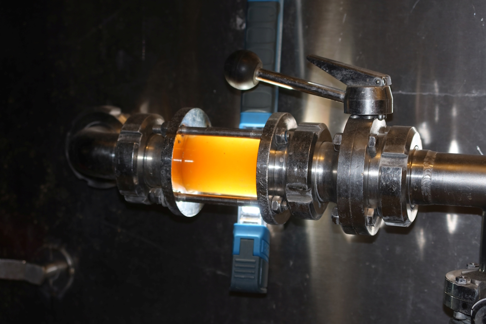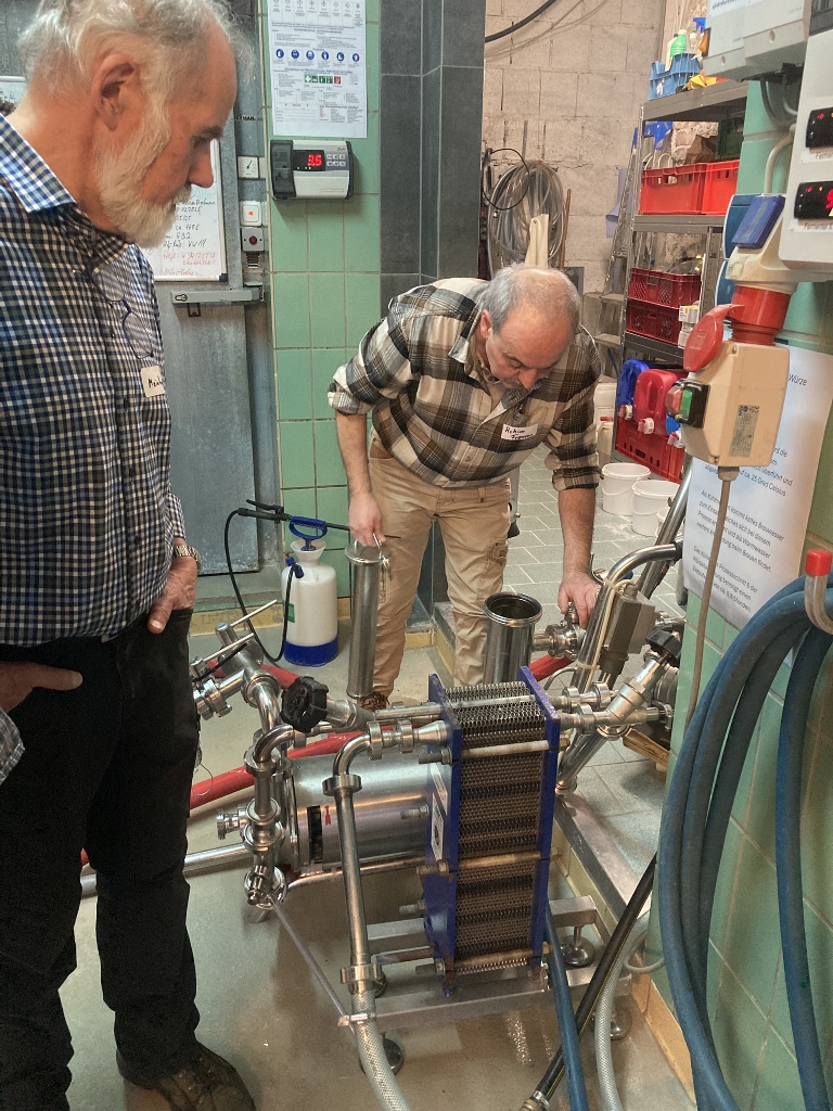 Da die Würze im Whirlpool mit ca 95°C viel zu heiß für die Gärung wäre und alle Hefen abtöten würde, muss sie auf ca 25°C heruntergekühlt werden. Dies geschieht mit Hilfe des Würzekühlers, der nach dem Prinzip eines Gegenstromwärmetauschers arbeitet. Von dort aus wurde die Würze direkt in den Gärbottich gepumpt.