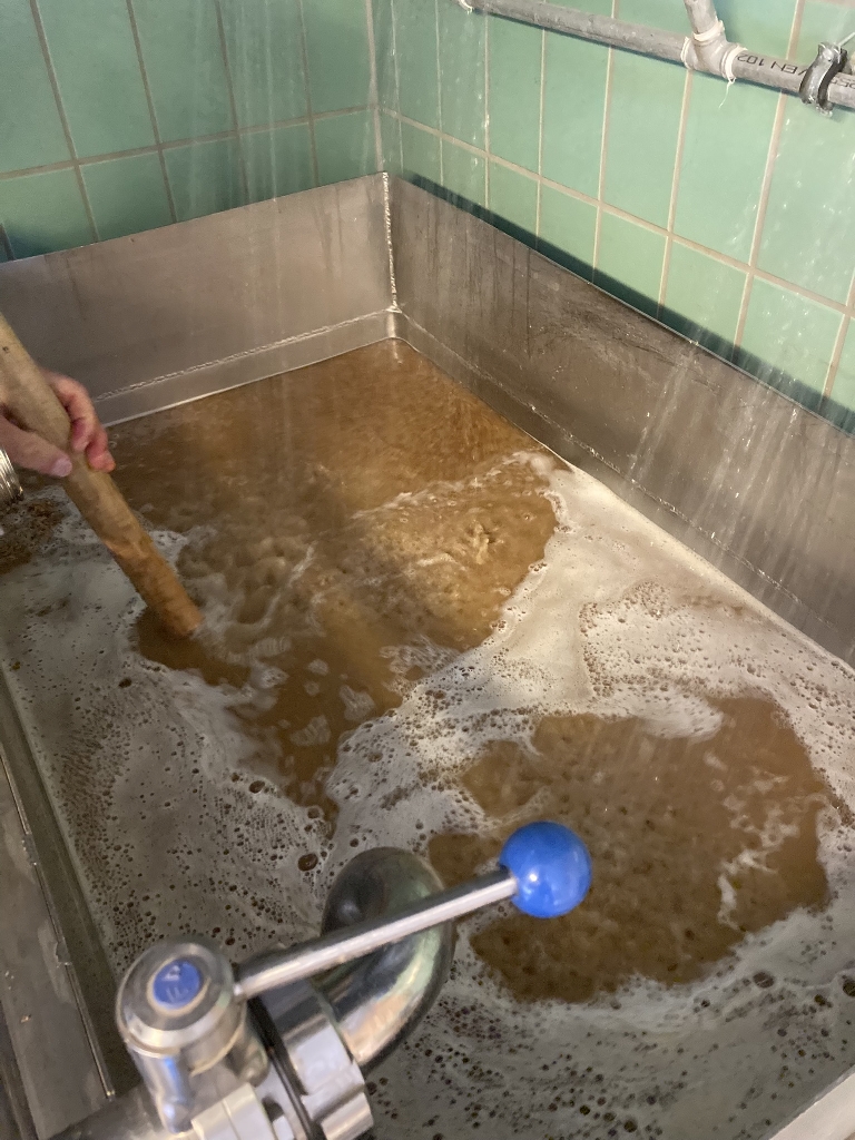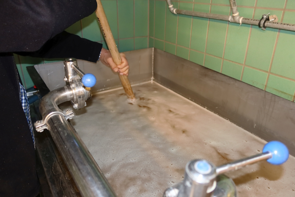 Läutern bedeutet bei der Würzeherstellung das Trennen der flüssigen von den festen Bestand der Maische. Nach einer kurzen Ruhephase von 5 Minuten (Läuterruhe nach einbringen der Maische) begann das Läutern, ein Prozess, der insgesamt 60 Minuten dauerte. Die flüssigen Bestandteile, die Läuterwürze, fließen dabei dem hydrostatischen Druck folgend in die niedrigerliegende Würzepfanne. Die festen Bestandteile wie Spelz, Grob- und Feingrieße und Mehl setzen sich im Läuterbottich ab und werden durch ein Sieb zurückgehalten. Alle 10 Minuten hat Udo weitere 250 Liter Wasser in Portionen von 50 bzw 75 Liter in den Läuterbottich laufen lassen und Meinhard hat die die abgesetzten Bestandteile, den Treberkuchen, mit einer Art Stechpaddel wieder aufgehackt, so dass weitere Zuckermoleküle aus der Maische herausgelöst werden konnten. Am Ende maß Karten Maß und bestimmte die Höhe des Flüssigkeitsstandes in der Würzepfanne: 92cm. Der im Läuterbottich abgesetzte Treber wurde von Torben mit einer Schaufel ausgescheppt. So schnell, dass selbst Braumeister Achim staunte. Ein Abnehmer dafür stand auch schon bereit, um es als Viehfutter mitzunehmen. Eine kleines Eimerchen Treber landete bei Udo, um es beim nächsten Brotbacken mit unter den Teig zu mischen.
