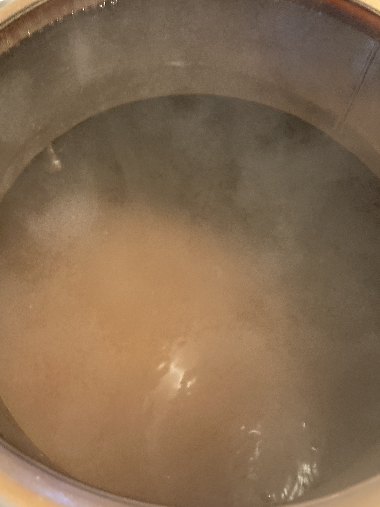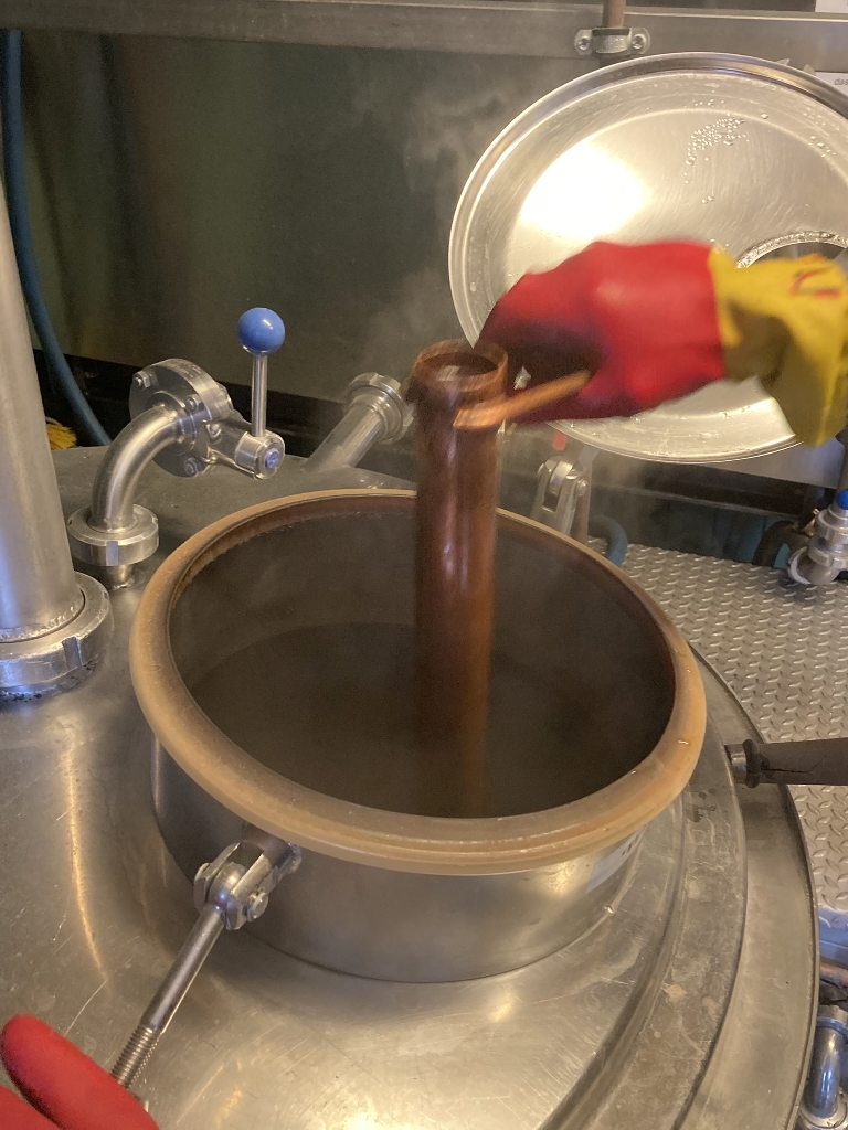 Die geläuterte Würze wurde nun für 1h 35min in der Würzepfanne gekocht. Zu Beginn des Kochvorgangs gab Steffi noch den Bitterhopfen (Sorten: Tettnanger und Magnum) dazu. Das Kochen verfolgt 6 Gründe, 1) wird zum Herauslösen der fettlöslichen Lupuline (Bitter- und Aromastoffe) aus dem Hopfen und Überführung in die Würze Hitze/Wasserdampf benötigt (der Fachmann sagt dazu, der Hopfen isomerisiert in dieWürze), 2) tötet das Kochen Keime in der Würze ab, 3) sorgt es für eine Koagulation (Gerinnung) des Eiweiß aus dem Malz, das schlecht für den Geschmack wäre, 4) inaktiviert es die Enzyme, 5) werden unangenehme Schwefelverbindungen (Dimethylsulfit) ausgetrieben und 6) wird dadurch die Stammwürze eingestellt (Zuckeranteil der Würze in %)