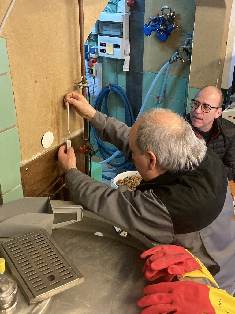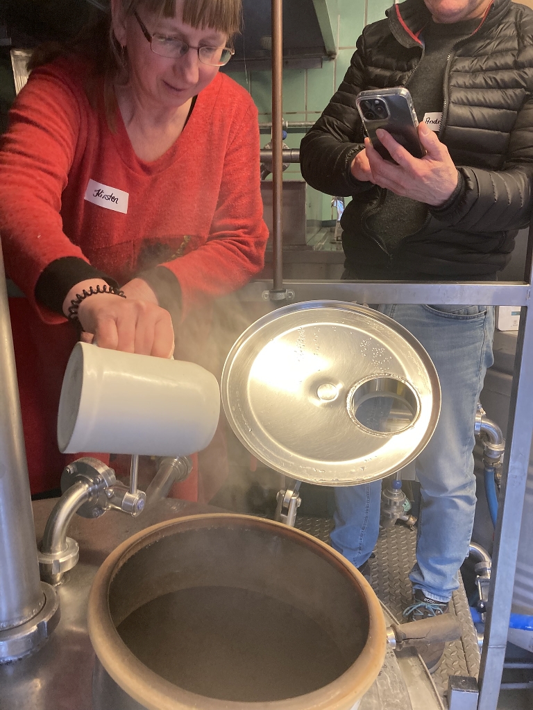 Am Ende des Kochens folgte noch die 2. Hopfengabe, die Kirsten vornahm. Diesmal Aromahopfen der Sorte Perle. Braumeister Achim hat noch eine Probe entnommen und die Stammwürze bestimmt. 12,4% zeigte die Meßspindel und lag somit ziemlich nahe an den avisierten 12,5%. Offenbar alles richtig gemacht bisher…
