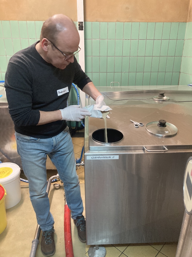 Als vorerst letzte Amtshandlung hat Andreas die Hefe (Saccharomyces cerevisiae, Stamm Weihenstephan Nr 34 von 1970, W34/70) zugegeben. Den Rest unserer Bierproduktion überlassen wir damit den Hefezellen, die in den nächsten 7 Tagen die Maltose in Alkohol verstoffwechseln.